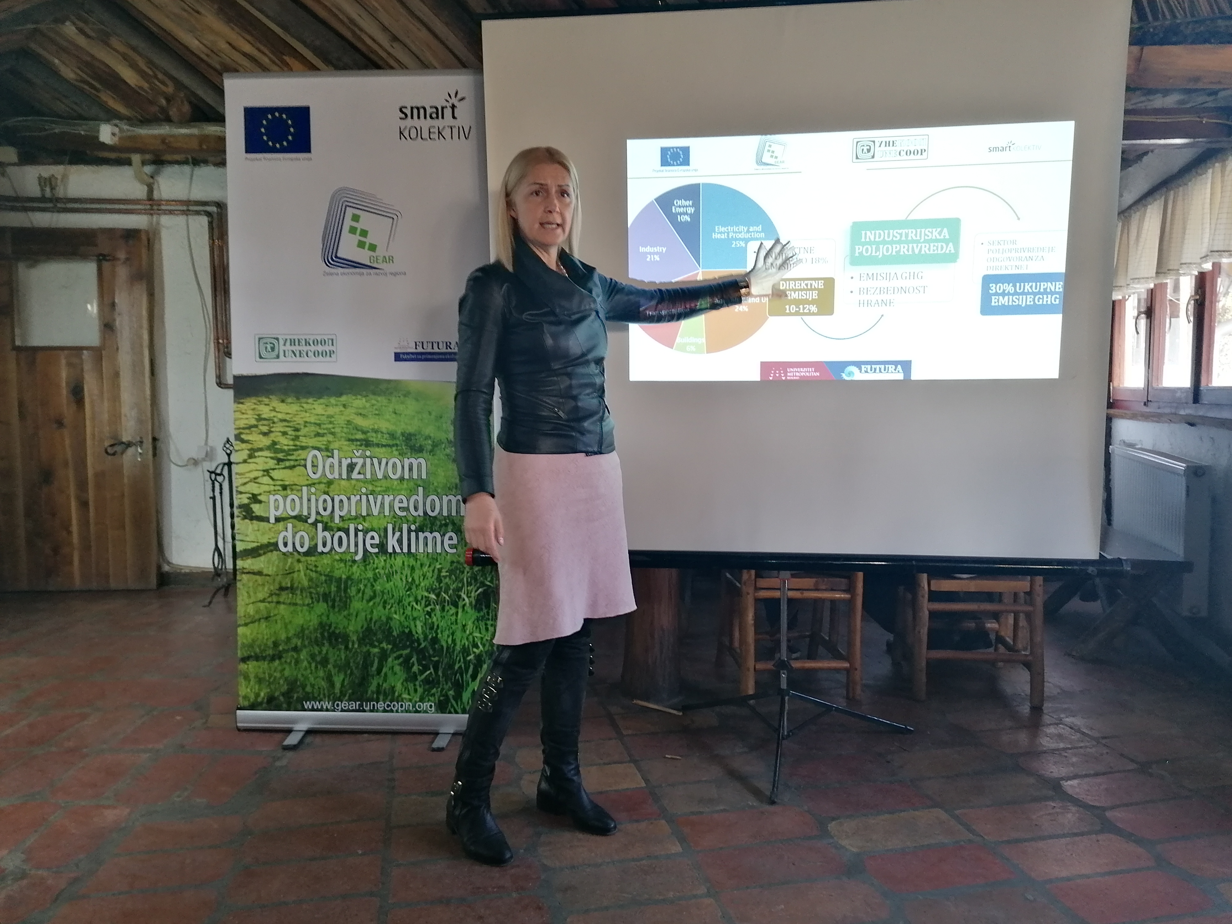 Panelistkinje radionice prof.dr.Sunčica Vještica sa Fakulteta za primenjuenu ekologiju “FUTURA”prisutne predstavnike poljoprivrednih gazdinstava, lokalne samouprave , OCD i fakulteta upoznala je sa uticajem poljoprivede na klimu , kao i potrebu za jačanjem adaptivnih potencijala poljoprivrede usled sve drastičnijih posledica klimatskih promena u obliku suše, poplava , oluja…